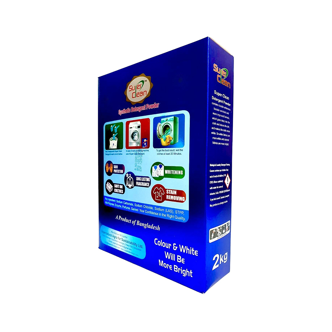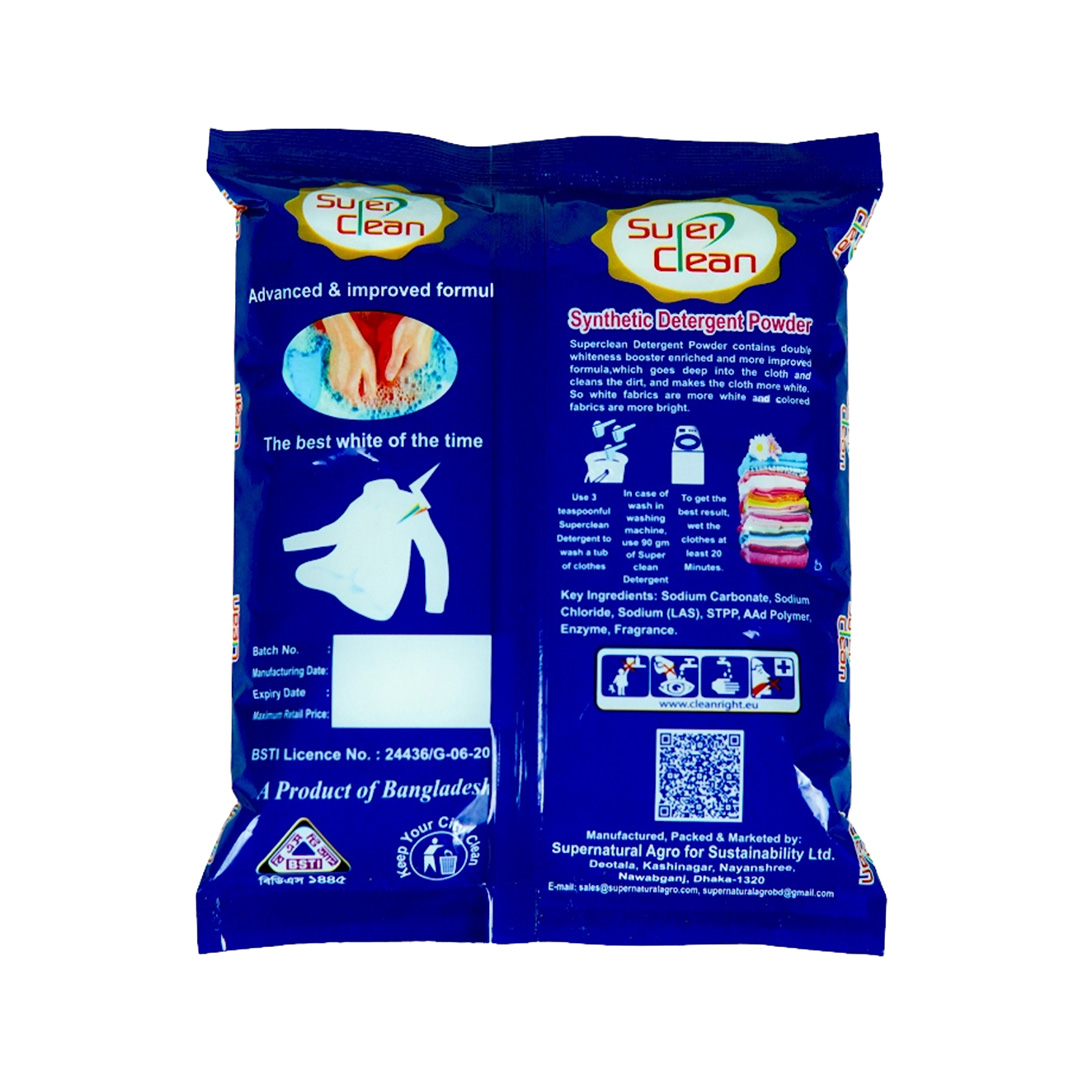 SuperClean Detergent Powder contains double whiteness booster enriched and more improved formula, which goes deep into the cloths, cleans dirt and makes white fabric whiter and colour fabric brighter.