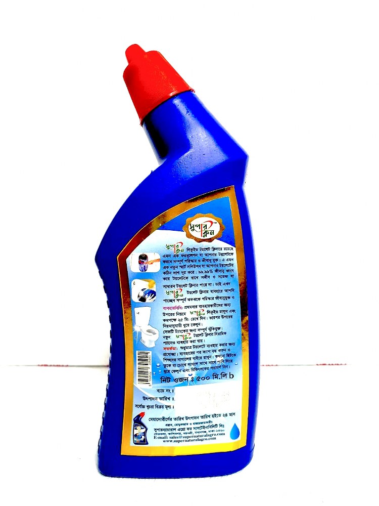Super Clean Toilet Cleaner, a powerful and effective cleaning solution designed for modern households. This product comes in a bold blue bottle with a red angled nozzle cap, ensuring precise application under toilet rims and hard-to-reach areas.