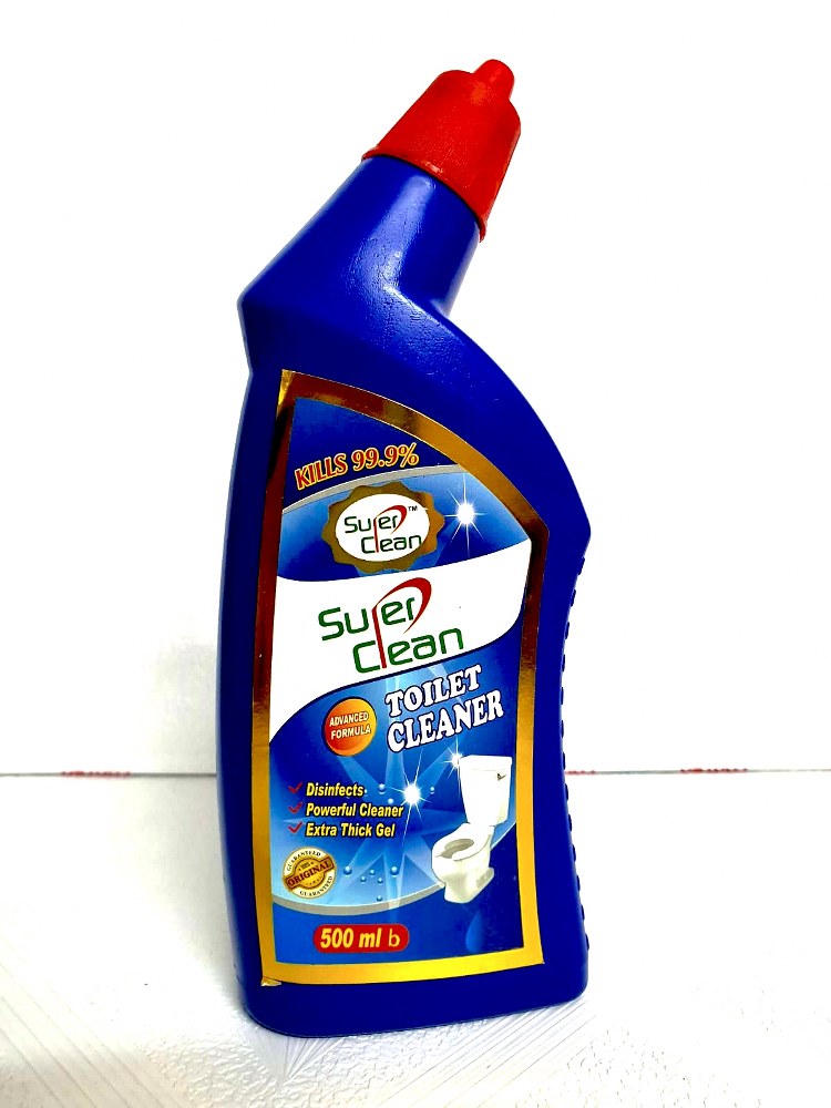 Super Clean Toilet Cleaner, a powerful and effective cleaning solution designed for modern households. This product comes in a bold blue bottle with a red angled nozzle cap, ensuring precise application under toilet rims and hard-to-reach areas.
